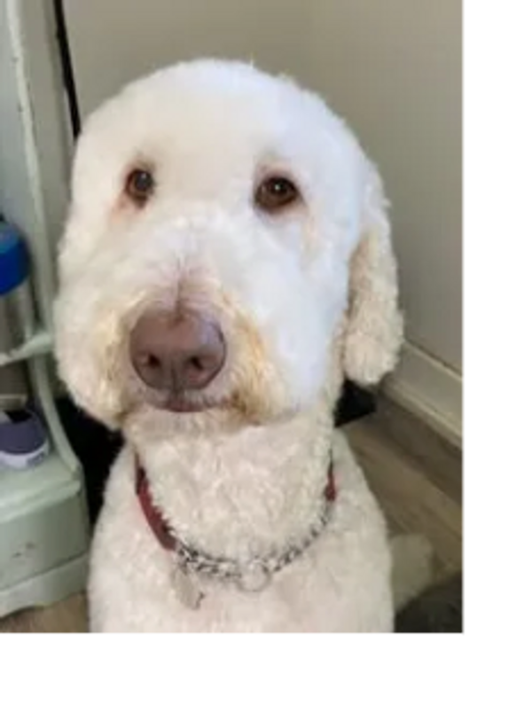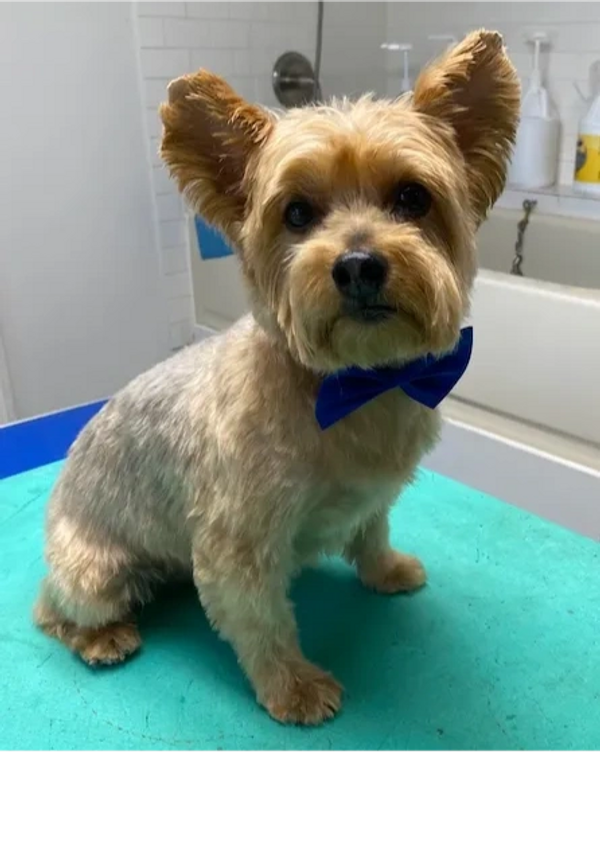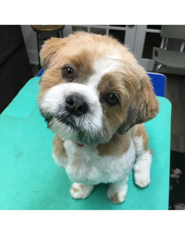 A full groom includes a tearless facial shampoo, a double-wash bath and hands-on dry. A customized haircut, gentle ear cleaning, paw-pad trim, nail trim, brush-out and sanitary clip if breed appropriate.